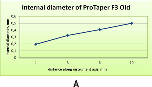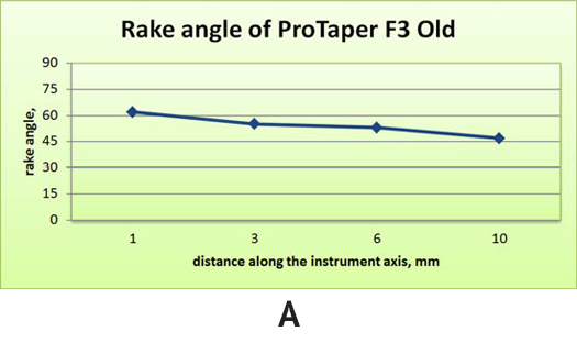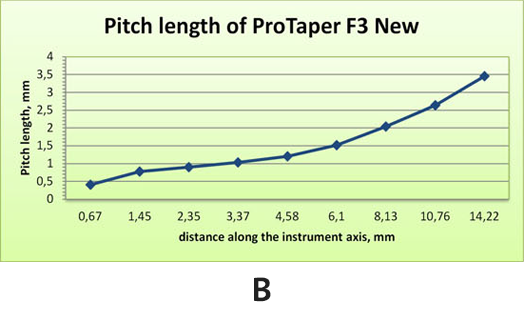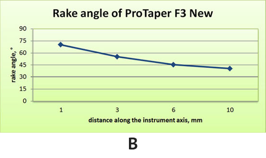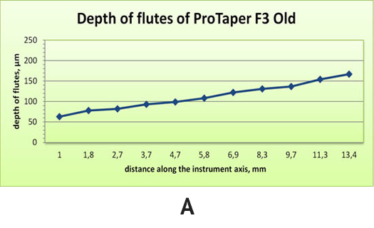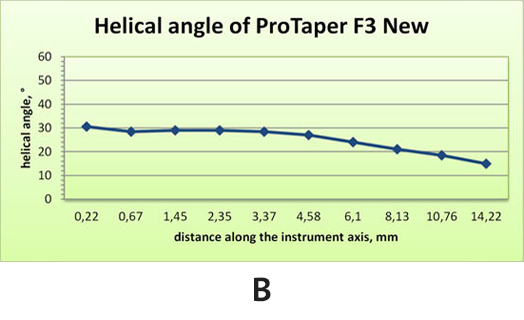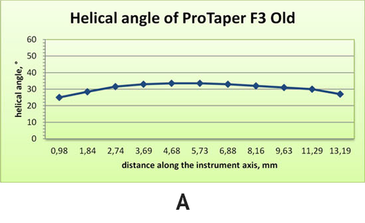 20 ProTaper F3 instruments (Dentsply Maillefer, Switzerland) were included in this study: 10 of the new design and 10 of the old design. A scanning electron photomicrographs were taken of each instrument Then all instruments were sectioned transversely at 1. 3, 6 and 10 mm from the tip and also examined by SEM. All images were captured digitally and the following design parameters were assessed by a direct measurement technique: helical angle, pitch length, depth of flutes, external and internal diameters, angles of cutting blades. All measurement values were analyzed mathematically to evaluate and compare instrument properties such as: flexibility, self-feeding force component, volume of fluting along the axis, safe depth of cutting per unit step of treatment.